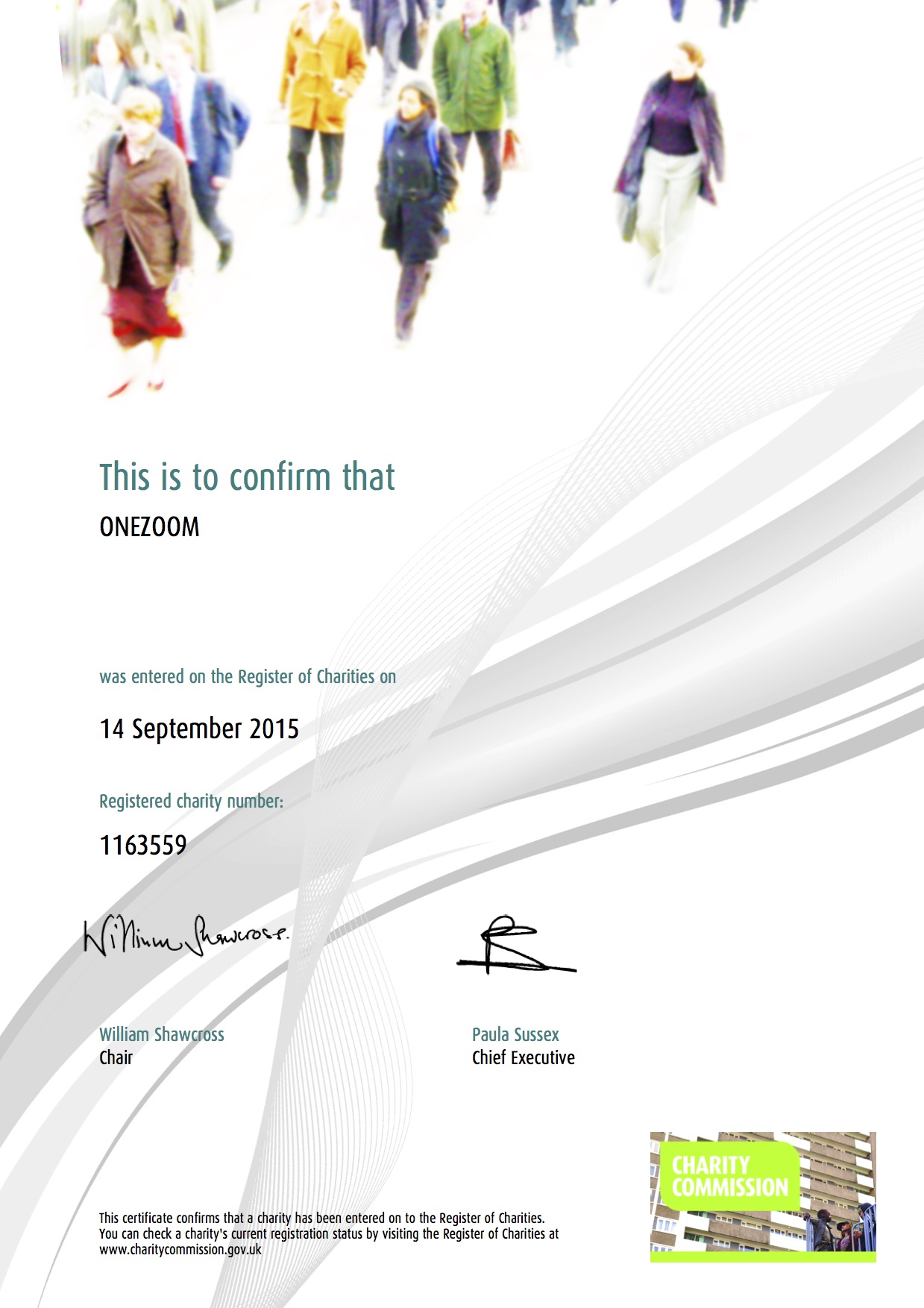 OneZoom is a registered UK charity, your donations help us provide easy access to scientific knowledge about biodiversity and evolution, the variety of life on Earth, and the need to conserve it.